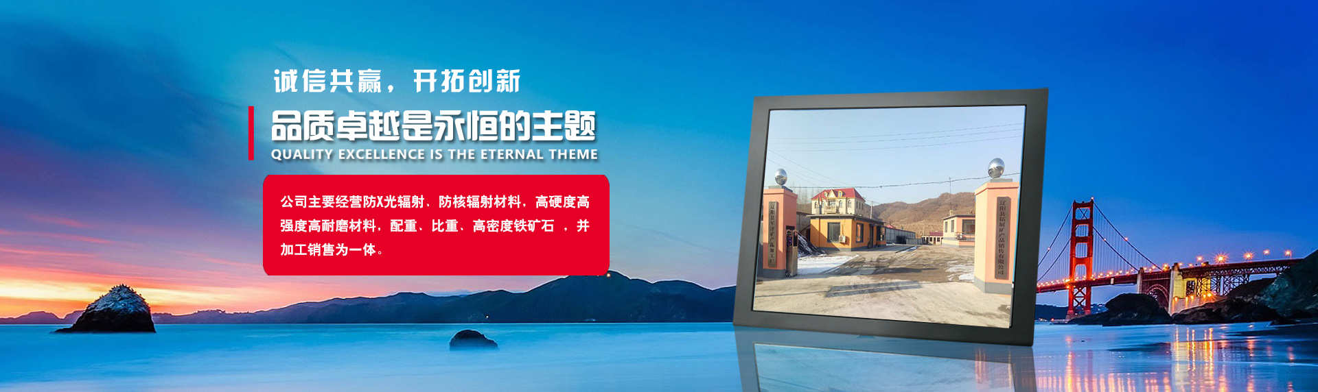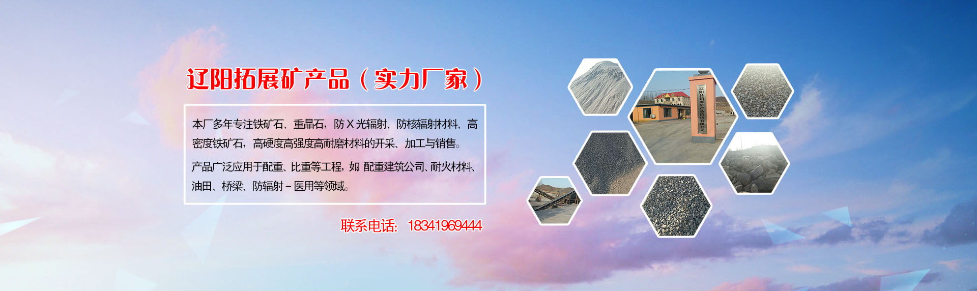 遼陽(yáng)縣拓展礦產(chǎn)品銷(xiāo)售有限公司坐落于遼寧省遼陽(yáng)市遼陽(yáng)縣寒嶺鎮(zhèn),礦產(chǎn)資源豐富,質(zhì)高價(jià)廉,公司年生產(chǎn)能力30萬(wàn)噸。公司主要經(jīng)營(yíng)防X光輻射、防核輻射材料,高硬度高強(qiáng)度高耐磨材料,配重、比重、高密度鐵礦石 ,并于加工銷(xiāo)售為一體。